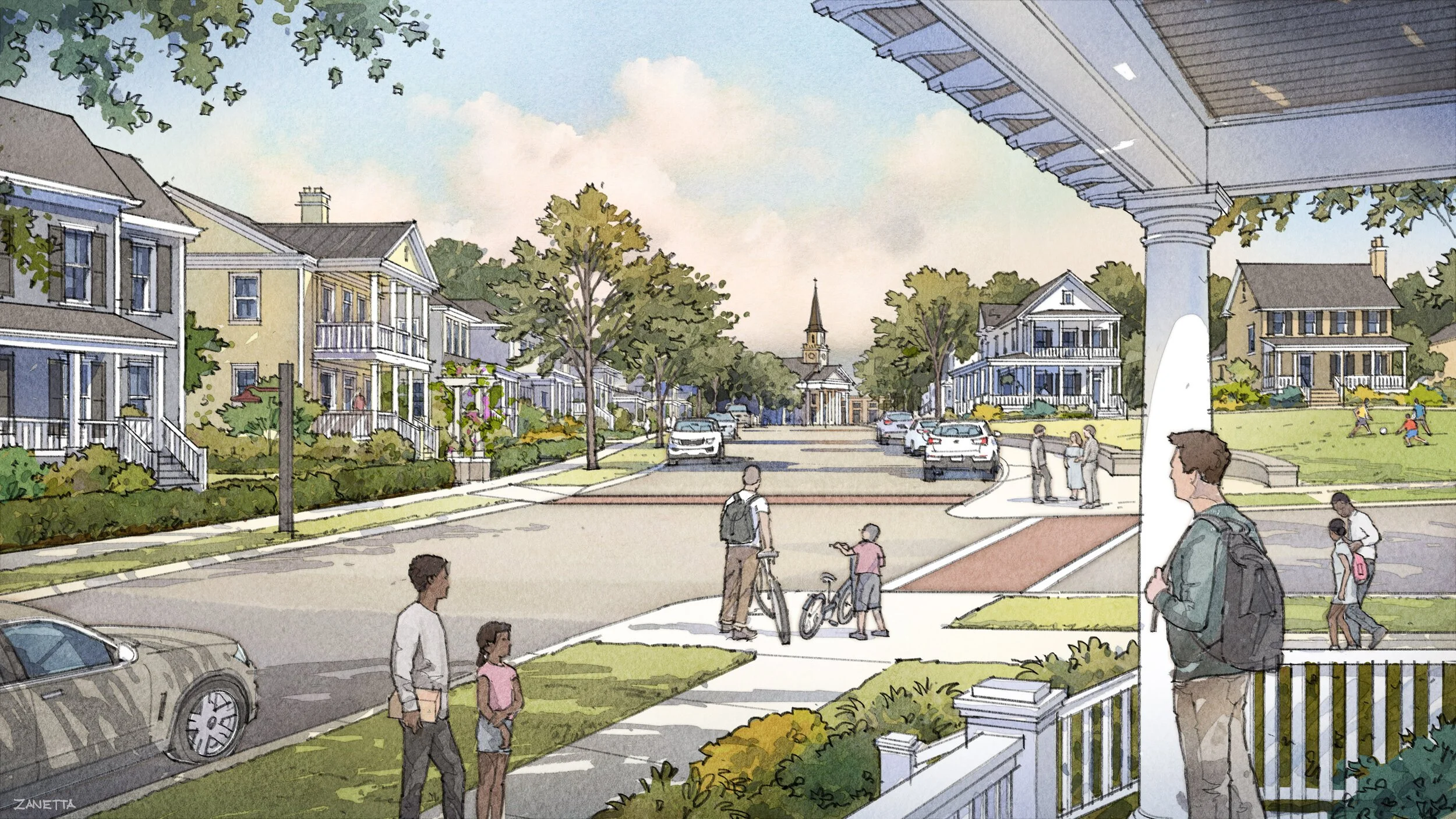 The Master Plan takes on the challenging site by including a network of streets and a variety of housing types, taking advantage of views of the lake and the hills. The street network hinges on Main Street which is perpendicular to the US highway (to maximize commercial visibility) and which is anchored by a commercial square and a civic plaza. The civic plaza is located on the high spot of the site, so the church that sits at the head of the plaza can be seen from many spots in the neighborhood. The plan includes a mix of uses, including a variety of residential buildings, a senior living facility, commercial buildings, a gas station, an inn, a church, an amphitheater, hikers’ cottages and a hikers’ chapel, and even proposes refurbishing one of the exiting barns for use as a neighborhood market.