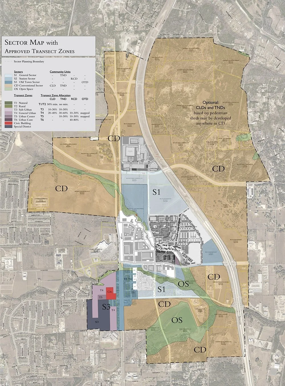 The City of Leander, Texas wanted to change their development pattern from sprawl to that of traditional, walkable, mixed-use neighborhood. In 2005, they adopted a SmartCode. Its details and Regulating Plan were resisted by developers. Recognizing that the issue was not the principles of form-based coding, but in the details of the SmartCode and Regulating Plan, as well as changes in the market, the city hired Michael Watkins Architect and Sandy Sorlien to work with residents, developers and the city planning staff to rewrite the 2005 SmartCode to encourage and incentivize development.