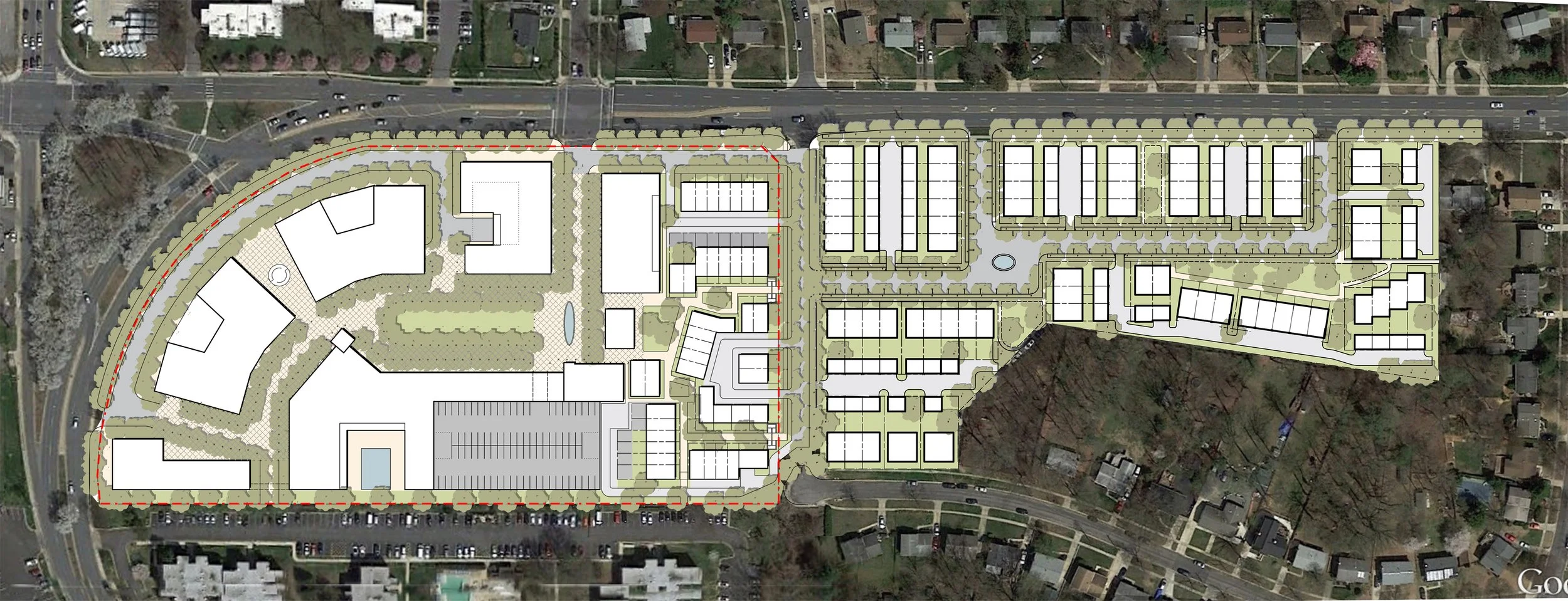 The plan incrementally replaces the existing shopping center, allowing the owner to keep tenants in place as long as possible. The eastern half of the property consists of townhouses on multiple greens, fronted by a tree-lined street leading to the dense mixed-use center. As the plan transitions to the most dense portion of the neighborhood, the vehicular street becomes a pedestrian passage, winding through a series of intimate townhouse courts, and finally arriving at the grand plaza and large green in the commercial center of the community. The focal point of the central plaza and green is a tower, that also catches views from the adjacent collector road, enticing visitors to enter the plaza and enjoy what makes it special.