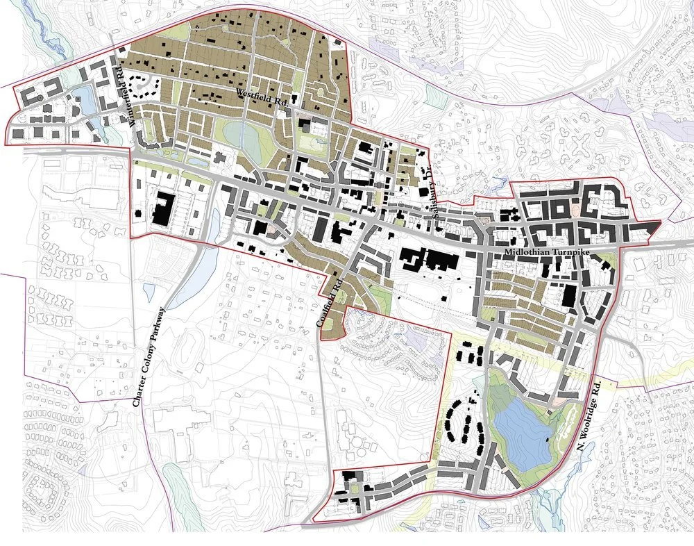 Midlothian, a suburb of Richmond, has a growing population and is a hub of commercial activity. However, the community is bisected by Midlothian Turnpike and lacks a clear center. Chesterfield County hired Michael Watkins Architect, LLC to prepare an illustrative master plan of a 400-acre study area, for which the county is preparing a “Special Area Plan.”