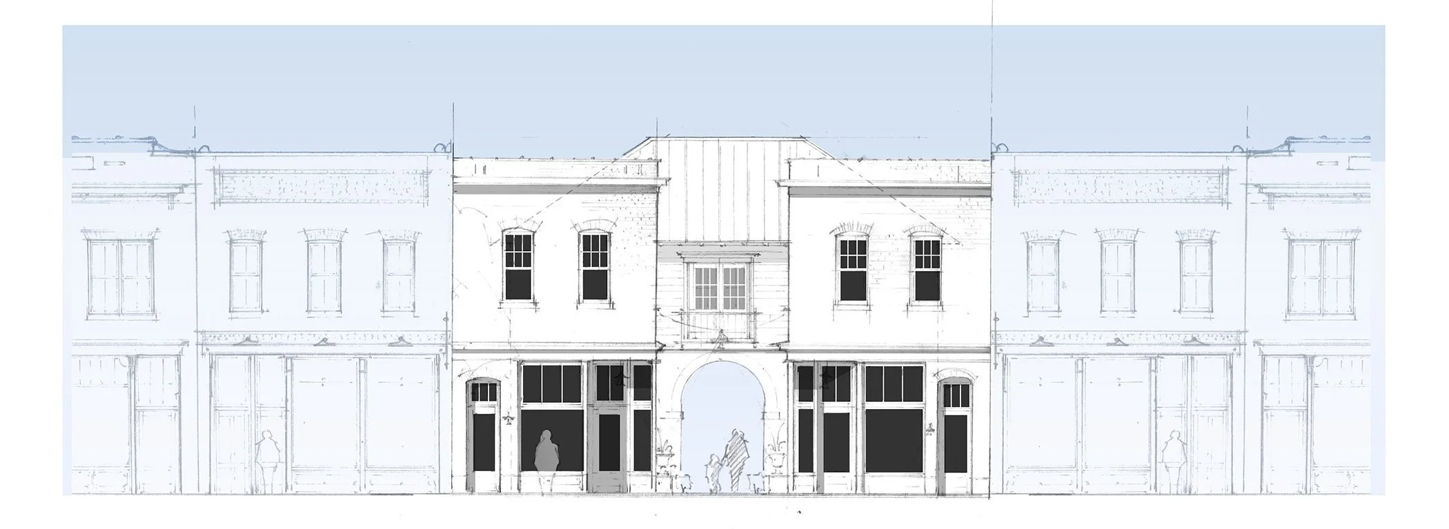 The plan is centered on a sequence of pedestrian spaces. A cottage court provides shared green space for residents, encouraging neighborly connection and informal gathering. On the commercial edge, a courtyard offers additional space for shopping and outdoor dining which is tucked away from the adjacent trucking route. The plan envisions a mix of small-scale building types—including cottages, garage apartments, four-plexes, live-work units, and the courtyard mixed-use building—carefully arranged to complement the existing urban fabric. Each building is designed with scale, massing, and detailing that reflect the historic character of Harlem’s downtown so that this infill development meets the community’s present needs in a way that is context-sensitive and clearly rooted in the heritage of the place.